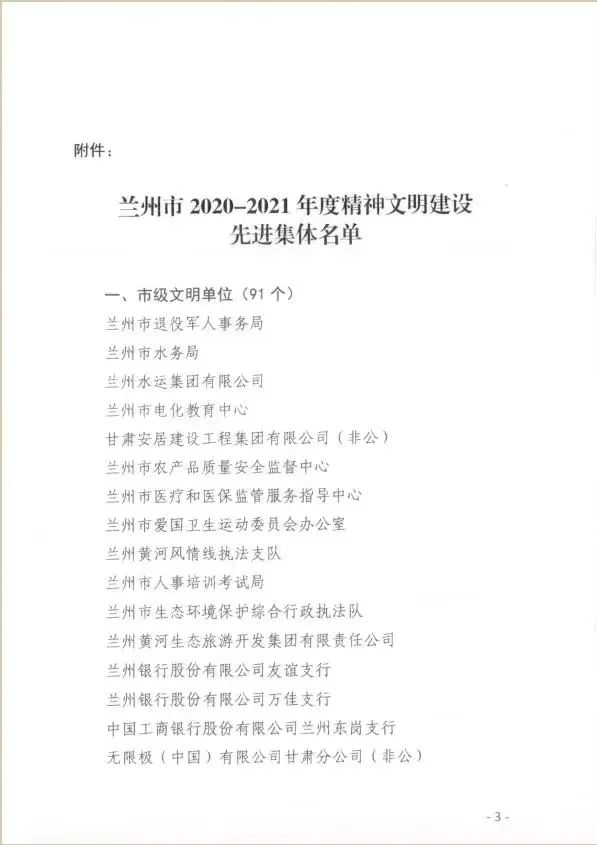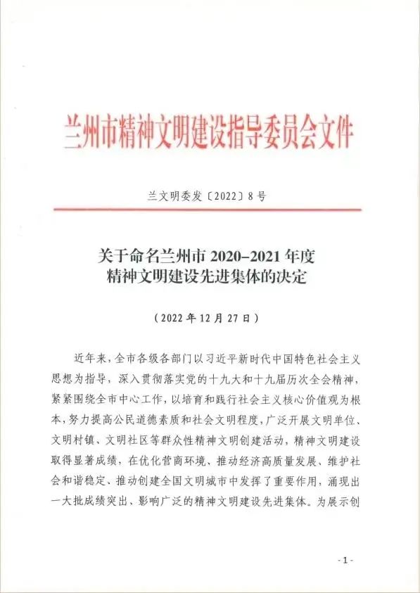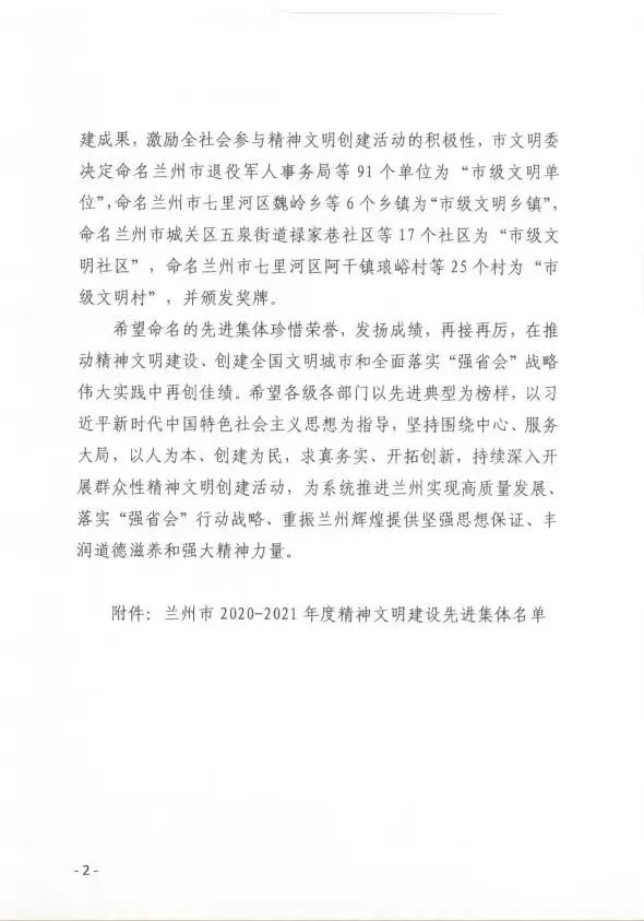 近日,兰州市文明办印发了《关于命名2020-2021年度精神文明建设先进集体的决定》,对在优化营商环境、推动经济高质量发展、维护社会和谐稳定、推动创建全国文明城市中涌现出的一大批成绩突出、影响广泛的精神文明建设先进集体进行命名。其中,兰州市退役军人事务局被命名为2020-2021年度市级文明单位。