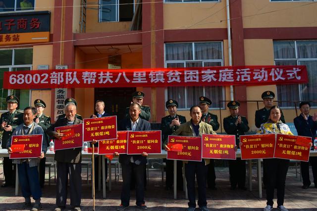 ---八里镇驻地某部开展贫困家庭帮扶活动 10月17日,虽然已是秋风送凉,但是在七里河区八里镇二十里铺村村委会院内,却充满了军民鱼水一家亲的浓浓暖意, 驻地某部官兵本着“手牵手扶贫济困,心连心共奔小康”的“拥政爱民”宗旨,积极筹措资金,对全镇7户生产生活较为困难的家庭进行救助,给每户发放慰问金2000元、优质燃煤1吨和其他生活用品,部队党委书记、政治委员许鲁明大校在现场向八里镇授发了部队定点帮扶乡镇匾牌,双方结成了帮扶对口单位。这充满关爱的举动,在金秋之际深深温暖了驻地群众的心,老兵候言忠作为受捐对象之一,用最独有的方式,向部队致以了最崇高的军礼。