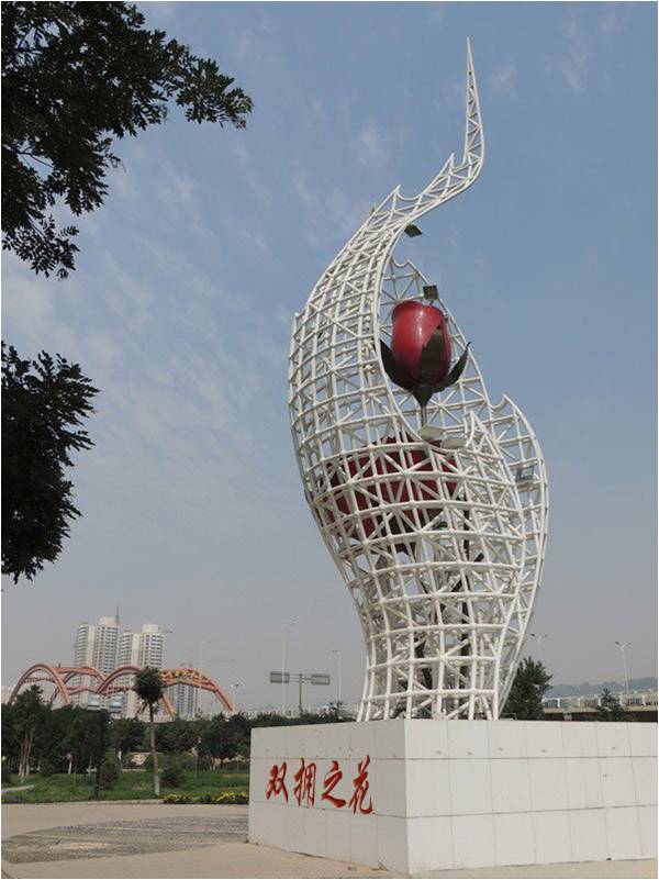 军地领导参加“双拥之花”雕塑揭幕仪式 兰州市双拥模范城雕塑——“双拥之花”,是兰州市争创全国双拥模范城“六连冠”标志性纪念建筑物,位于进出兰州城区主干道入口处。雕塑以兰州市花玫瑰为创意主体,总高20.1米,其中主题雕塑为钢结构,高18米。雕塑中两朵绽放的玫瑰花寓意“双拥”的今天和明天,两片镂空的叶子分别代表军队和人民,共同呵护着美丽鲜艳的玫瑰花。 “双拥之花”雕塑是在全国范围公开征集雕塑方案,经专家多次论证,公开招标所进行的一项艺术雕塑工程。雕塑由北京龙艺源文化艺术有限公司创作,兰州市城市建设管理委员会承建,雕塑创建历时3年多,于2009年7月31日竣工。双拥模范城纪念雕塑的建成,是兰州军民政治生活中的一件大喜事,是献给建国60周年、兰州解放60周年的一份贺礼。双拥模范城纪念雕塑的设立,体现了兰州军民鱼水深情,彰显着兰州军民创建双拥模范城的辉煌业绩,表达了全市军民进一步弘扬双拥光荣传统,凝聚军心民心,再创双拥佳绩的决心和信心,具有明显的政治意义和广泛的社会意义。 耸立在黄河岸边的“双拥之花”雕塑是兰州市城市雕塑艺术的亮点,成为兰州黄河风情线重要一景,受到兰州市民和国内外游客广泛关注,它告诉每一位来到这里和生活在这里的人们:兰州是一座军政军民团结,社会和谐进步的双拥城;是一座军政军民“同呼吸,共命运,心连心”的模范城;在全市军民携手浇灌下,“双拥之花”将更加灿烂辉煌。