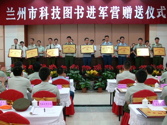 为推动“科技图书进军营”活动广泛深入开展,2007年1月,我市举行“兰州市科技图书进军营活动”启动仪式,市委、市政府领导、兰州军区政治部首长出席并发表热情洋溢的讲话。市委、市政府分管领导代表市双拥工作领导小组向驻军受援基层单位赠送图书。此后,每年“科技图书进军营”活动都要组织图书赠送仪式,市双拥工作领导小组领导参加,为每个部队基层图书室统一制作悬挂“援建军营图书室”标识。