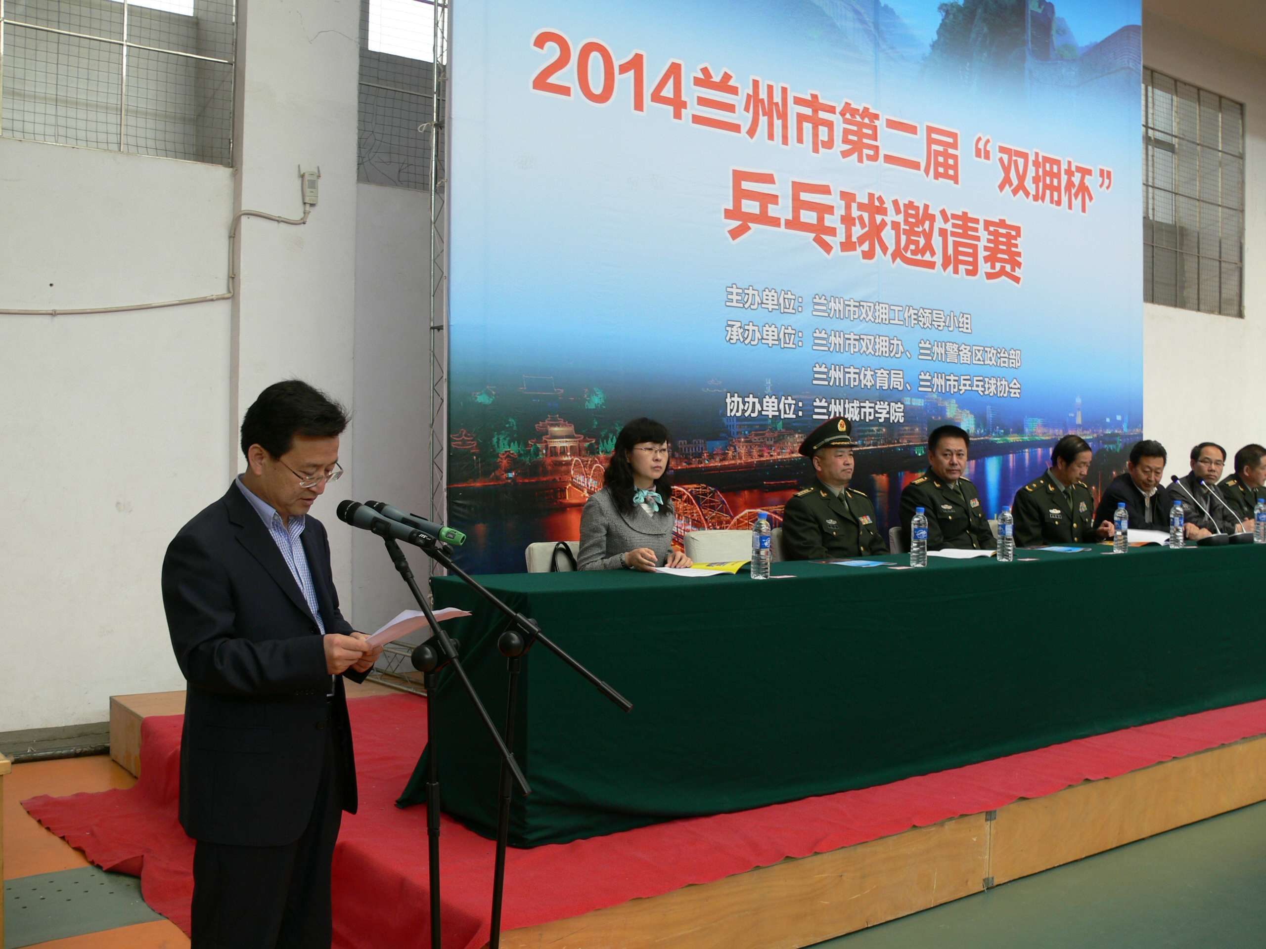 今年是我市创建双拥模范城“八连冠”的冲刺之年。为营造双拥创建氛围,增进军地双方交流与友谊,由市双拥工作领导小组主办,市双拥办、兰州警备区政治部、市体育局、兰州市乒乓球运动协会承办的2014年兰州市第二届“双拥杯”乒乓球邀请赛,于4月29日至30日在兰州城市学院举行。 4月29日上午09:00,2014年兰州市第二届“双拥杯”乒乓球邀请赛开赛仪式在兰州城市学院体育馆举行。开赛仪式由市民政局局长田明主持,兰州警备区政治部主任陈武大校发表热情洋溢的致辞,省民政厅巡视员、省双拥办副主任张和平同志宣布2014年兰州市第二届“双拥杯”乒乓球邀请赛开赛。 这次邀请赛得到驻军部队、市直部门和企事业单位的积极响应,市双拥工作领导小组成员单位、驻兰师以上部队、部分双拥工作成绩突出的企事业单位的29支代表队、150余名乒乓球爱好者参加比赛。兰州军区政治部副主任王文杰少将、68002部队政治委员许鲁明大校出席开赛仪式并参加比赛;省民政厅巡视员、省双拥办副主任张和平,省双拥办专职副主任刘来群应邀出席开赛仪式;兰州警备区政治部主任陈武大校、甘肃预备役高炮师政治部主任蒋卫民大校、兰州军区空军政治部双拥办主任刘景双上校带队参加比赛;省双拥办专门组队参赛,体现了军地领导和单位对比赛的大力支持。兰州市乒协、市体育局、兰州城市学院为本次邀请赛提供有力保障,确保了比赛圆满顺利。 本次邀请赛吸引了全市众多高水平业余乒乓球爱好者参赛,经过两天紧张激烈的角逐,兰州石化公司、兰州龙辰五金机电市场、兰州西固热电有限公司、市国资委代表队荣获男子团体前四名;市国资委、兰州西固热电有限公司、市邮政业联合队荣获女子团体前三名;赵洁冰、蔡君嘉良、丁文超、张晨曦、王从怀、马志才、朱文东、朱华荣获男子单打前八名;赵红莲、李旭霞、田敏、张莉莉、陈艳艳、徐苹、苏怀燕、韩世君荣获女子单打前八名;兰州军区空军、兰州警备区、市公安局、市财政局、市民政局、国电兰州热电有限责任公司六个单位被授予兰州市第二届“双拥杯”乒乓球邀请赛优秀组织奖。