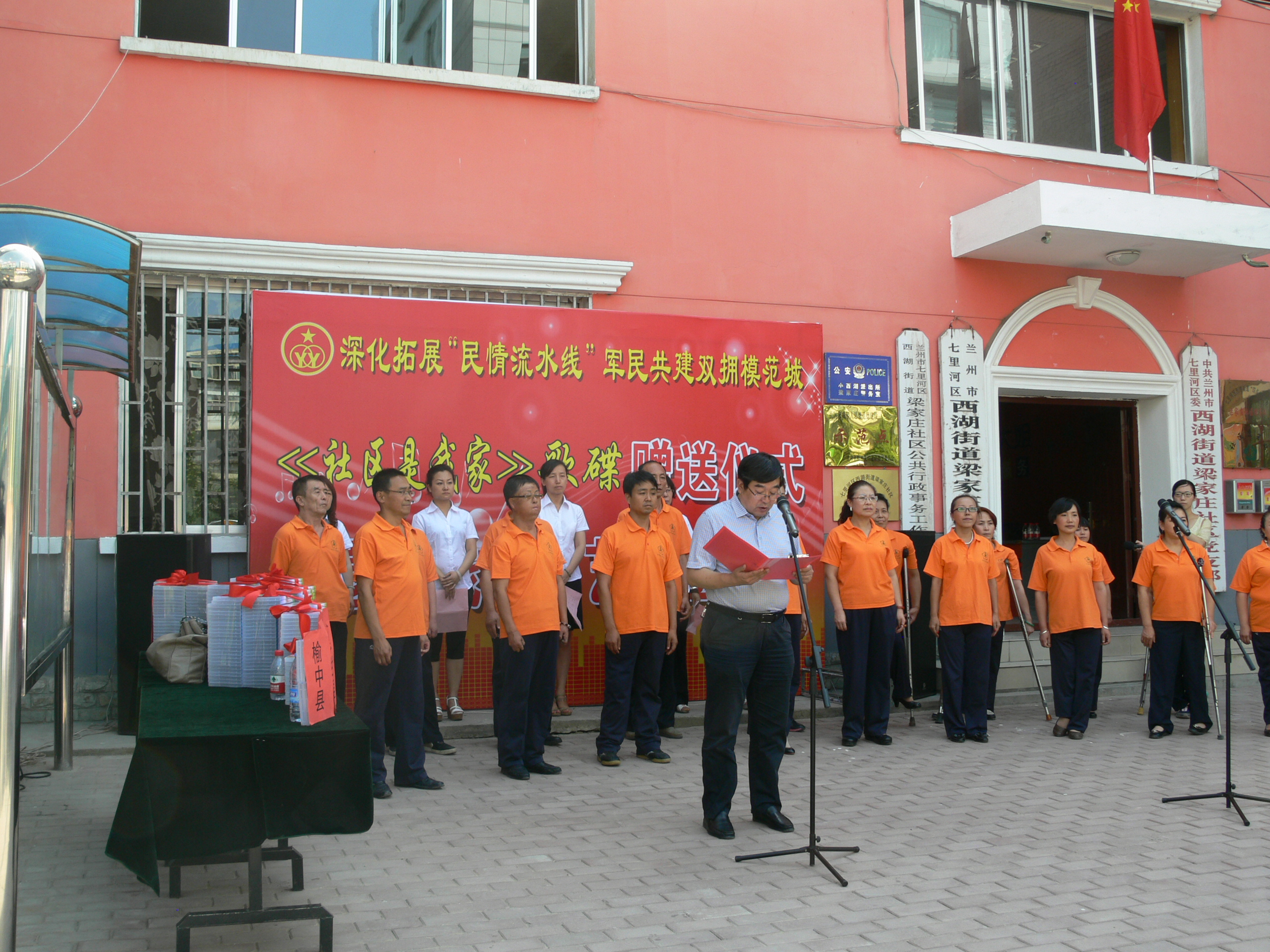 8月7日下午,由甘肃省军区副政委倪永盛少将作词,国家交响乐团合唱队演唱的歌曲《社区是我家》歌碟赠送仪式在七里河区西湖街道梁家庄社区举行。市委常委、兰州警备区政委李军大校、七里河区委书记石镜如、省双拥办专职副主任刘来群、兰州警备区政治部主任刘克难大校等军地领导出席赠送仪式。 近年来,在兰州警备区、七里河区人武部和驻区部队的大力帮助下,七里河区西湖街道梁家庄社区以“四点半”工程、民情流水线工程、三维数字社区为代表的为民服务体系不断充实完善。今年4月份,省双拥工作领导小组副组长、省军区副政委倪永盛少将在考察七里河区西湖街道梁家庄社区时,详细查看了“三维数字社区”和“民情流水线”工程的服务内容、工作流程和为民服务方面取得的成效,观看了残疾人艺术团的演唱,被社区服务群众的细致工作所感动,被居民以社区为家的热情所感染。凭着明锐观察,经过理性思考、细致酝酿,倪永盛政委亲自创作了《社区是我家》歌词,并请国家交响乐团谱曲演奏,制作了歌碟,无偿为全市每个社区赠送一套,搭建了双拥共建新桥梁。 《社区是我家》从建设和谐邻里关系,共建和谐社区的角度,立足小社区,勾画了大社会的一幅幅和谐生动的生活画面,表达了社区居民对和谐美好生活的向往和赞美,开创了全市社区歌曲文化先河。唱响《社区是我家》对增强基层工作者服务群众的自豪感、责任感,激发广大市民住在社区、热爱社区、建设社区的热情,具有重要意义。 活动现场,七里河区残疾人艺术团演唱了歌曲《社区是我家》,兰州警备区对残疾人艺术团进行了慰问。(市双拥办) |