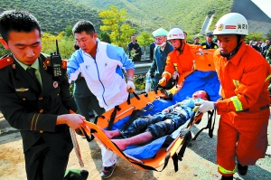 路遇交通事故,不顾自己发烧的孩子,曲波(左二)赶忙下车帮忙救援。 本版照片由本报记者 党运 摄