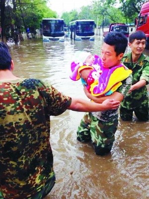 6月3日,暴雨急袭金城,西固区古浪路一片汪洋,子弟兵涉水救出被困婴儿。网友供图